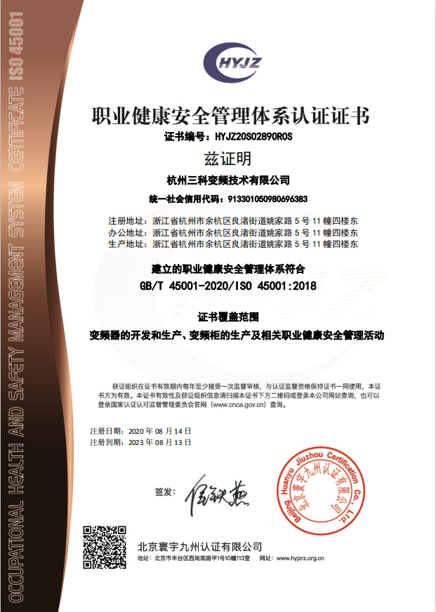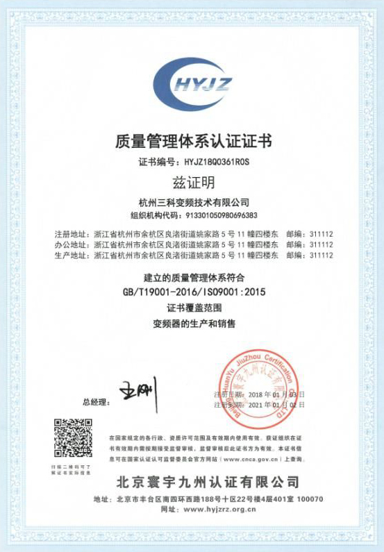 杭州三科變頻技術(shù)有限公司通過iso9001認證