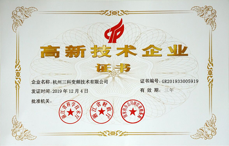 杭州三科變頻器技術(shù)有限公司高新技術(shù)企業(yè)認證