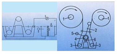 上圖是卷染機(jī)工作的示意圖,這是一個(gè)典型的中心卷曲控制系統(tǒng)。未染色的布匹首先通過上布電機(jī)卷曲到其中的一個(gè)輥筒上,在輥筒的傳動(dòng)軸上安裝有計(jì)數(shù)用地接近開關(guān),此時(shí)控制系統(tǒng)計(jì)下整卷布的道次,上卷完畢,采用人工的方式把布匹的一頭卷到另外一個(gè)輥筒上面,待包覆緊密即可正常開始工作。此時(shí)兩個(gè)輥筒朝著同一個(gè)方向運(yùn)轉(zhuǎn),控制的要求是保持布匹上的張力恒定,保持布匹在染液經(jīng)過的時(shí)間一致,也就是線速度恒定。這是個(gè)沒有線速度反饋的驅(qū)動(dòng)系統(tǒng),但線速度又實(shí)實(shí)在在地隨著輥筒的半徑的變化在變化。因此,控制系統(tǒng)需要適應(yīng)這種獨(dú)特的要求。