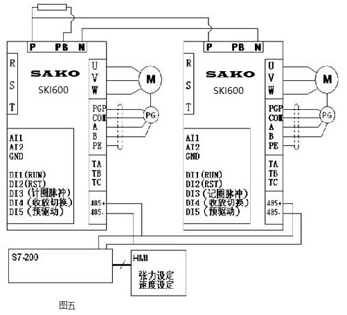 由卷染機(jī)的工作原理可見,放卷的電機(jī)始終處于發(fā)電模式,通常的做法都是采用制動(dòng)單元、制動(dòng)電阻,將制動(dòng)產(chǎn)生的能量以熱量的形式消耗掉。對(duì)于卷染機(jī)這樣長(zhǎng)年累月工作在發(fā)電模式下的設(shè)備來說,這種方式電能的浪費(fèi)是大量的。SKI600可以方便支持公共直流母線,我們?cè)趯?shí)踐中將兩臺(tái)變頻器的PN母線直接并聯(lián),這樣正常工作制動(dòng)產(chǎn)生的能量通過并聯(lián)的母線又回到拖動(dòng)的電機(jī)。為了考慮在快速減速的時(shí)候,有可能兩臺(tái)電機(jī)都處于發(fā)電狀態(tài),在其中的一臺(tái)變頻器上面仍舊并聯(lián)了一個(gè)制動(dòng)電阻,這個(gè)電阻的工作是短時(shí)的,能耗很小。老是卷染機(jī)控制柜下方很大的一個(gè)電阻箱現(xiàn)在可以完全取消了,既節(jié)省了能耗,又避免了很大的一個(gè)熱源,從而系統(tǒng)的可靠性也得到了提高。