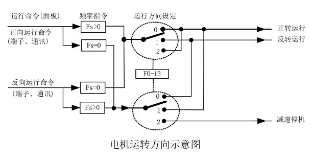 在有的驅(qū)動系統(tǒng)中,只允許系統(tǒng)正轉(zhuǎn)運轉(zhuǎn)而不允許反轉(zhuǎn)運轉(zhuǎn),則需求將F0-13=2,此時若呈現(xiàn)反轉(zhuǎn)指令,則VFD將減速至0并進(jìn)入停機狀態(tài),同時操作面上FWD/REV不斷閃爍。