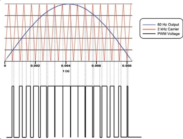 5.脈沖寬度調(diào)制(PWM):一種VFD控制方案,其中通過使用一組6個(gè)電源開關(guān)(通常為I G B T)使用恒定的DC電壓來重構(gòu)模擬交流電壓波形。有效電壓可以通過改變固定幅度脈沖的寬度來控制。這種脈寬調(diào)制方案是有效的,因?yàn)殡姍C(jī)是一個(gè)大電感,不允許電流像電壓一樣脈動(dòng)。正確排序后,PWM以近乎完美的正弦波形輸出電機(jī)電流。