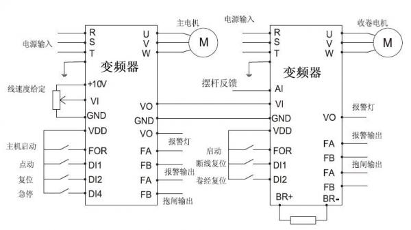 3、多組繼電器輸出。拉絲主機變頻器繼電器( FB.FC)為斷線故障報警輸出,繼電器(KA,KB)為系統(tǒng)減速停車時低頻抱閘輸出,實現(xiàn)卷取電機低速制動。卷取電機變頻器繼電器( FB,F(xiàn)C)為斷線故障報警輸出,繼電器(KA,KB)為排線電機啟?;芈贰J箍刂凭€路設(shè)計簡單方便,保證因發(fā)生異常導(dǎo)致的停車的運行系統(tǒng)的安全性殛延續(xù)性。