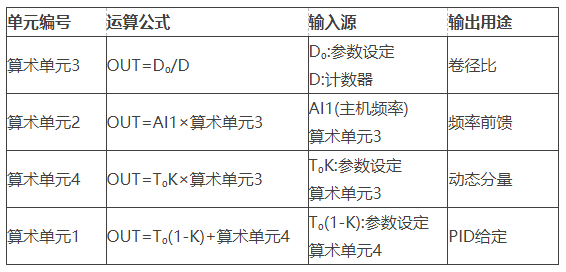graph TD A[主機(jī)頻率F0] --> B[算術(shù)單元2] C[實(shí)時(shí)卷徑D] --> D[算術(shù)單元3] D -->|D0/D| B B --> E[頻率前饋] F[張力設(shè)定T0] --> G[算術(shù)單元1] H[錐度系數(shù)K] --> G D --> I[算術(shù)單元4] I --> G E --> J[頻率合成] G --> K[PID控制器] L[張力反饋] --> K K --> J J --> M[收卷電機(jī)]
