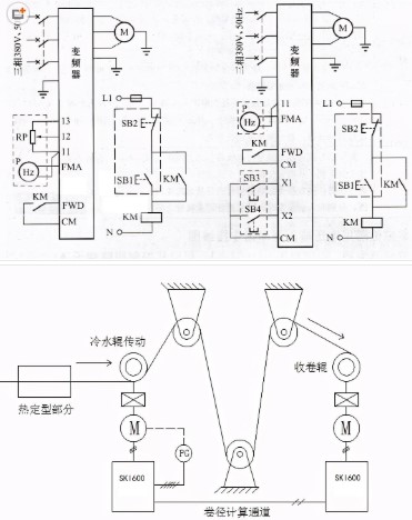 SKI600通用重型VFD的關鍵功能是線圈直徑計算、扭矩補償和張力錐度。一般來說,有三種方法可以檢測線圈直徑。第一種方法是通過傳感器直接測量線圈直徑。由于傳感器需要現(xiàn)場安裝,成本會增加,故障率也會增加,所以在實際中很少使用;第二種方法是厚度積分法,其優(yōu)點是控制簡單,但缺乏靈活性,需要在產品品種變化時調整參數(shù)。第三種方法是線速度計算方法,通過檢測車輪的轉速和滾筒的轉速來計算滾筒的當前直徑。該方法具有較高的計算精度。由于系統(tǒng)已經(jīng)有了線速檢測和滾筒速度檢測,所以系統(tǒng)采用了冷水滾筒驅動VFDA0口模擬輸出的形式,這也是實際領域中應用最廣泛的方法。