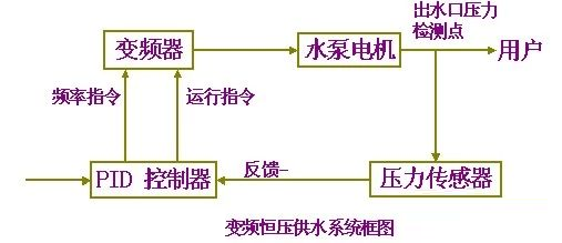 設(shè)備實(shí)時(shí)通過傳感器檢測出口壓力,將檢測值和設(shè)定值進(jìn)行比較運(yùn)算,確定電機(jī)及水泵投入臺套數(shù)和變頻器輸出頻率(反應(yīng)到電機(jī)及水泵為轉(zhuǎn)速)以追貼用水曲線實(shí)現(xiàn)恒壓。