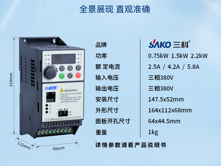 安裝需由電氣專業(yè)人員操作,接地電阻小于 0.1Ω,電機電纜超 50m 建議加裝輸出電抗器,說明書詳細標注端子功能與尺寸(部分型號 68mm×164mm×112mm,凈重 0.75kg),方便部署。