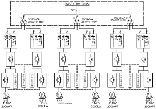 機(jī)車有牽引模式和制動模式,當(dāng)機(jī)車測時牽引模式時,機(jī)車牽引電機(jī)帶動試驗臺電機(jī),機(jī)車電動模式,試驗臺處于發(fā)電模式,試驗臺向機(jī)車加載,機(jī)車試驗臺中的1號變流器力矩模式運行,其他5臺從機(jī)力矩跟隨。保證6軸出力相同。當(dāng)機(jī)車測時制動模式時,試驗臺中1號變流器運行速度模式,其他5臺從機(jī)力矩跟隨。保證6軸出力相同。