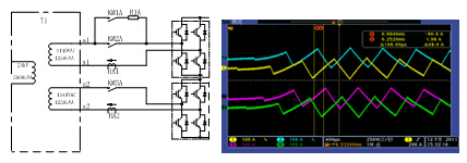 鐵路上供電電源為單相25kV,試驗臺的電源是鐵路電網(wǎng)中取電,采用25kV的電源供電。兩臺變流器中共4個模塊的輸入電流錯相控制,通道1(黃色)和通道2(藍(lán)色)為一臺變流器的兩個模塊輸入電流,通道3(紫色)和通道4(綠色),為另一臺變流器輸入電流。